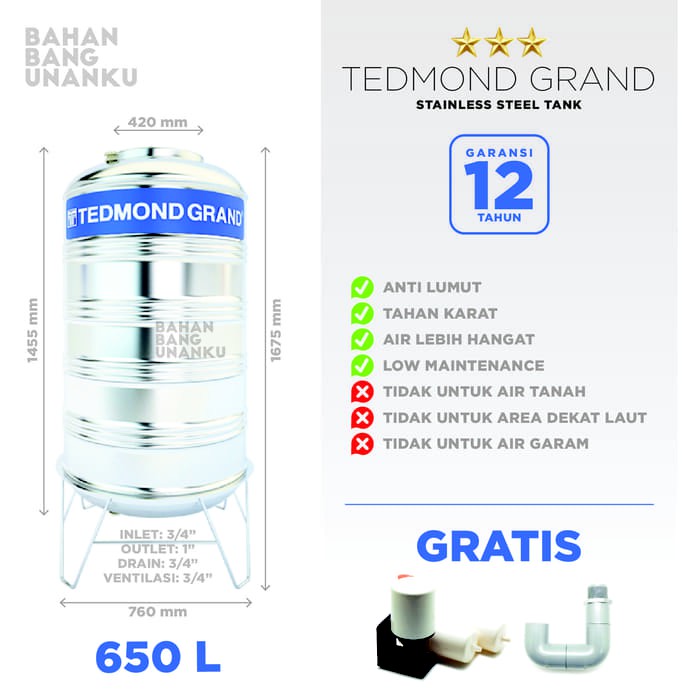Tandon air jenis stainless steel ini terbuat dari stainless steel tipe 304 yang memiliki kombinasi kandungan kromium (18%) dan nikel (8%), sehingga kandungan anti karatnya merupakan yang tertinggi. Harga yang bersaing bukan berarti kualitas tidak terjamin, semua produk tangki air stainless kami garansi 10 tahun, cukup beli sekali pakai selamanya, mudah perawatan, tidak akan karat selamanya. Tangki air stainless steel atau stainless steel water tank adalah salah satunya type tangki air untuk bak penampungan air yang seringkali dipakai. Harga mesin kangen water, harga mesin air kangen. Pipa dekoratif kurang cocok digunakan sebagai pipa aliran uap panas pada distilator skala kecil karena pertimbangan 5 siku stainless steel tipe 304 dan 201.